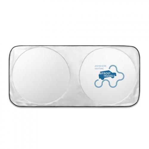 Autozonnescherm van 210d polyester met twee ronde delen met een diameter van 65 cm. Deze innovatieve vorm is ideaal voor warmere dagen. Geleverd in een ronde tas van 210d polyester dus gemakkelijk op te bergen
