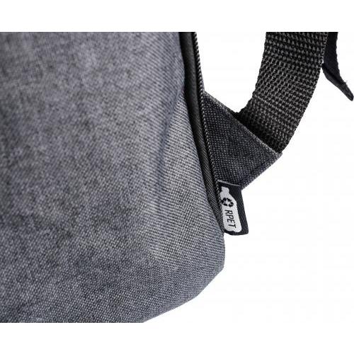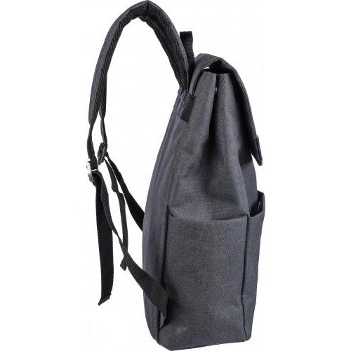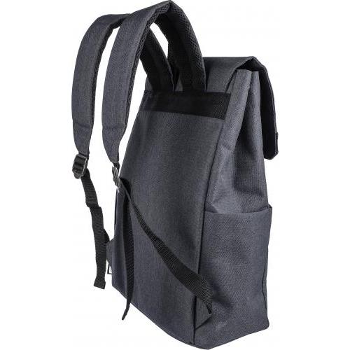 600D polyester canvas laptop rugzak (15 inch) met PVC-detail en 210D voering. Voorzien van een klein voorvak met rits en een karabijnhaak voor sleutels, een zijvak met rits, een regulier zijvak en een groot vak met magneetsluiting en laptopvak. Drukknoppen aan de zijkant om de rugzak te sluiten wanneer deze niet volledig gevuld is. Verstelbare ventilerende schouderriemen. Inclusief een rPET-label aan de voorkant.