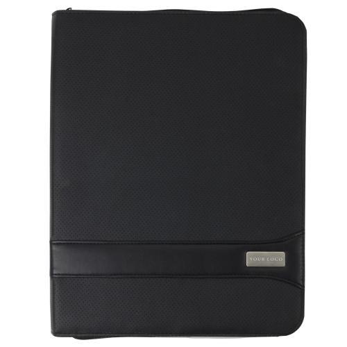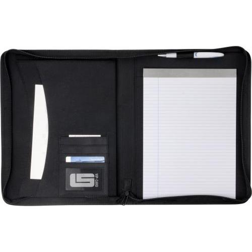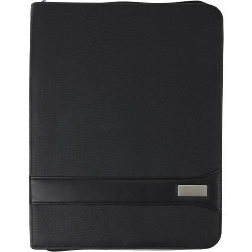 PVC documentenmap 'geperforeerd' (A4) met ritssluiting en met twee grote en vier kleine insteekvakken en penlus. Deze map wordt geleverd incl. gelinieerd schrijfblok (30 vel).