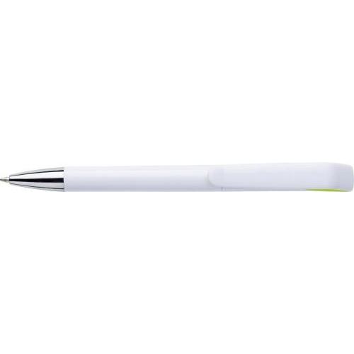 Kunststof balpen met gekleurde elementen, blauwschrijvend, met de clip in de vorm van een geometrische zwanenhals, met draaimechanisme.