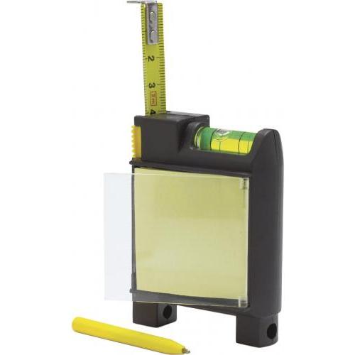 Geijkte kunststof rolmaat (2 meter), met waterpas, metalen riemclip, notitieblaadjes en kunststof balpen.