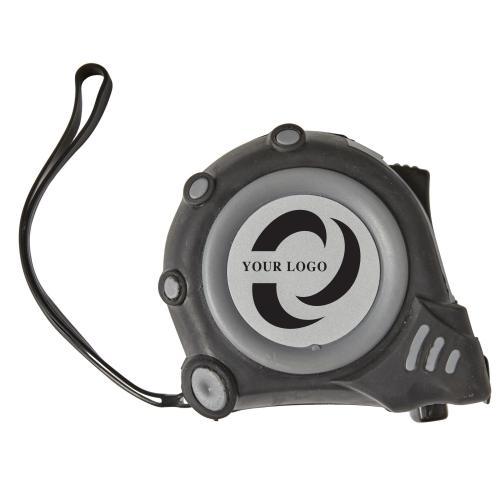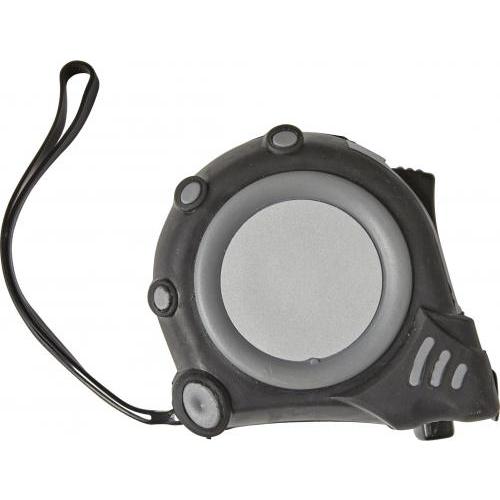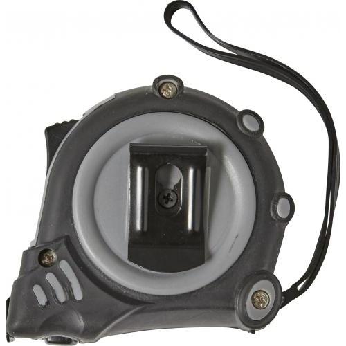 Geijkte kunststof rolmaat (5 meter) met meetlint in centimeters en inches, met riemclip en polskoord.