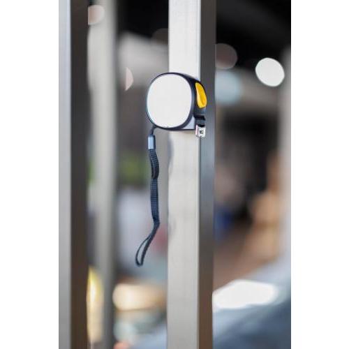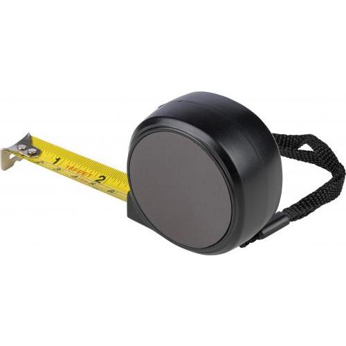 ABS rolmaat met magnetische zijde voor eenvoudige bevestiging op metalen oppervlakken. Voorzien van een 5 meter lange en 19 millimeter brede metalen meetband met schaalverdeling in centimeters en inches. Inclusief drukknop bovenop voor vergrendelen/ontgrendelen en polsband van polyester. Individueel verpakt in een bruine kartonnen doos met illustratie.