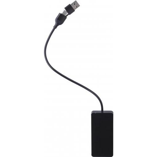 Aluminium USB hub met 3 poorten. Twee USB A- en één USB C-poort. Gerecycled logo gegraveerd op de voorkant.