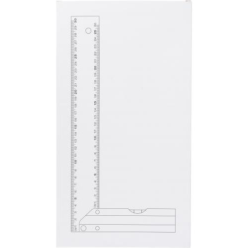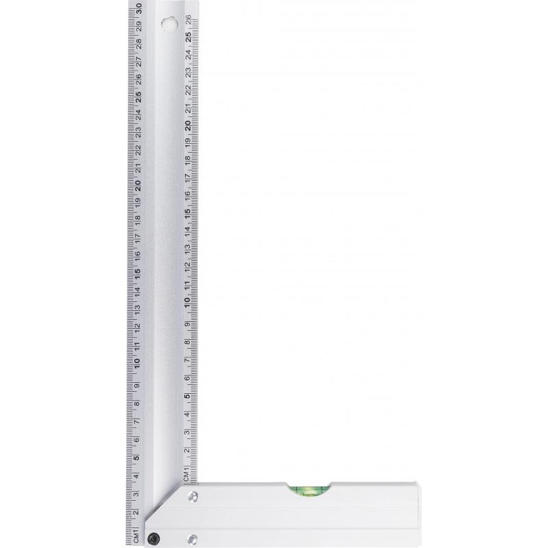 Aluminium winkelhaak met geïntegreerde waterpas. Lengte 30?centimeter met duidelijke centimeterverdeling. Praktisch ontwerp voor nauwkeurig meten en waterpassen. Individueel verpakt in een bruine kartonnen doos met illustratie.