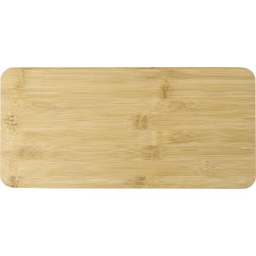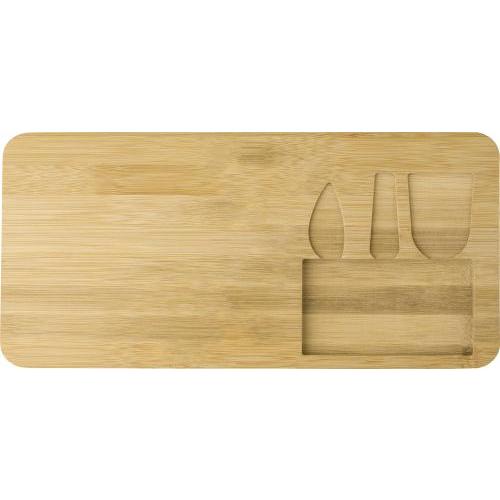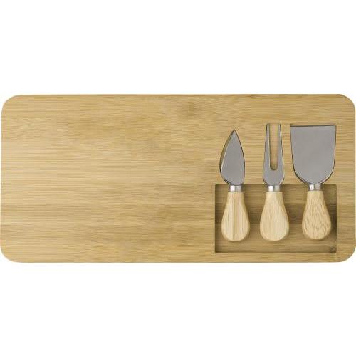 Bamboe kaasplank met drie messen die elk in uitsparingen in de plank passen. Individueel verpakt in kartonnen doos.