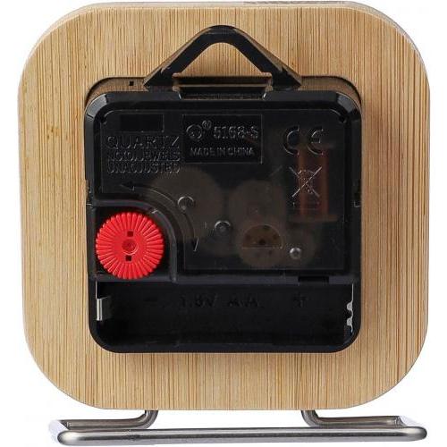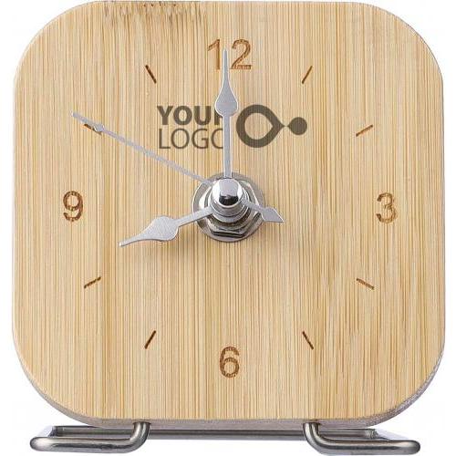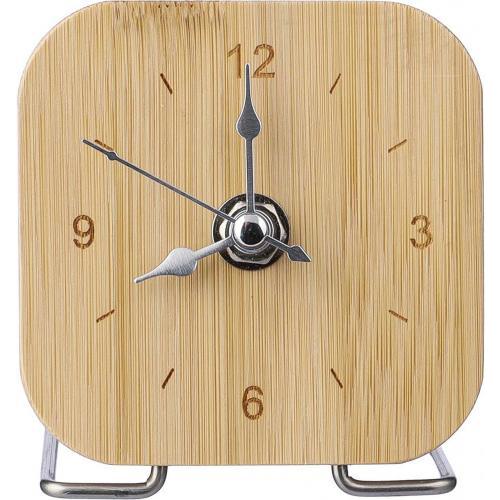 Bamboe klok met zilveren wijzers en standaard. Inclusief batterij. Per stuk verpakt in een bruine kartonnen doos.