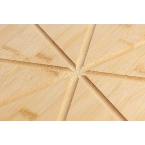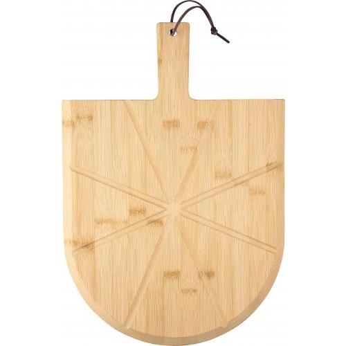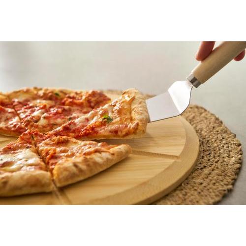 Bamboe pizzaplank met handvat en voorgevormde snijgeleiders voor eenvoudig serveren. Inclusief een roestvrijstalen en beukenhouten pizzasnijder en spatel. Voorzien van een ophangkoord van PU aan het handvat. Een praktische 3-delige set bestaande uit plank, spatel en pizzasnijder. Individueel verpakt in een bruine kartonnen doos.