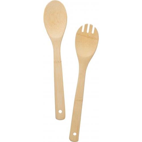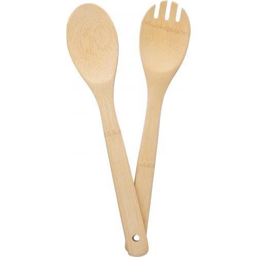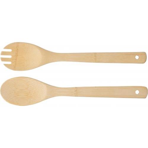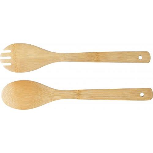 Bamboe saladebestek. Het bestek heeft gaatjes aan het uiteinde van het handvat. Verpakt in een katoenen trekkoordzakje.