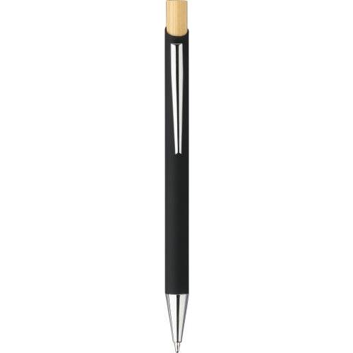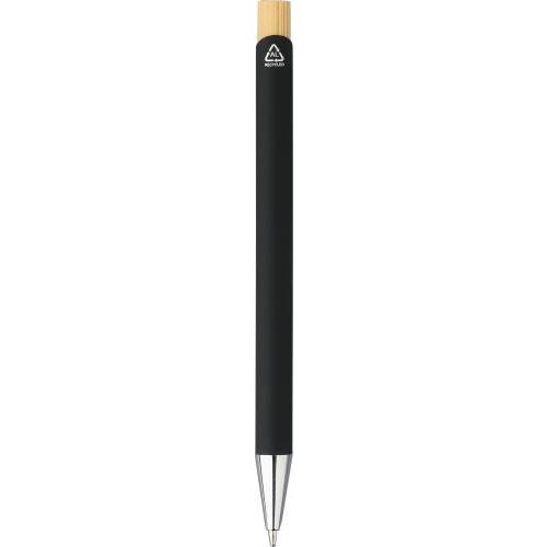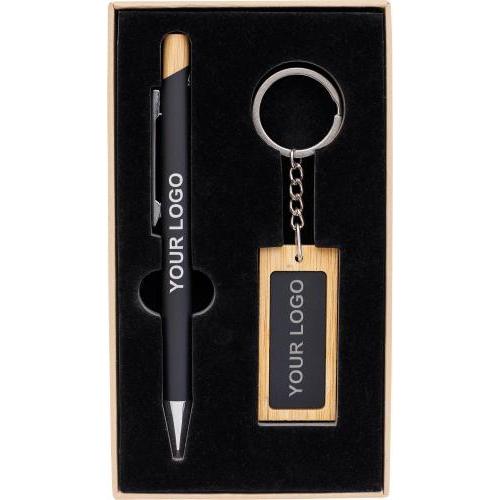 Bamboe schrijversset bestaande uit een bamboe en rubbercoating gerecyclede aluminium balpen met blauwe inkt, bamboe drukknop en verchroomde kunststof punt. Met een bamboe en rubbercoating roestvrijstalen rechthoekige sleutelhanger. Beide items hebben een spiegeleffect na lasergravure en zijn voorzien van een gerecycled aluminiumlogo. Verpakt in een kraftpapieren doos met fluwelen inlay.
