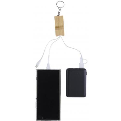Bamboe sleutelhanger telefoonhouder met oplaadkabels. Type-C, lightning en USB-A/C. Individueel verpakt in een bruin kartonnen zakje.