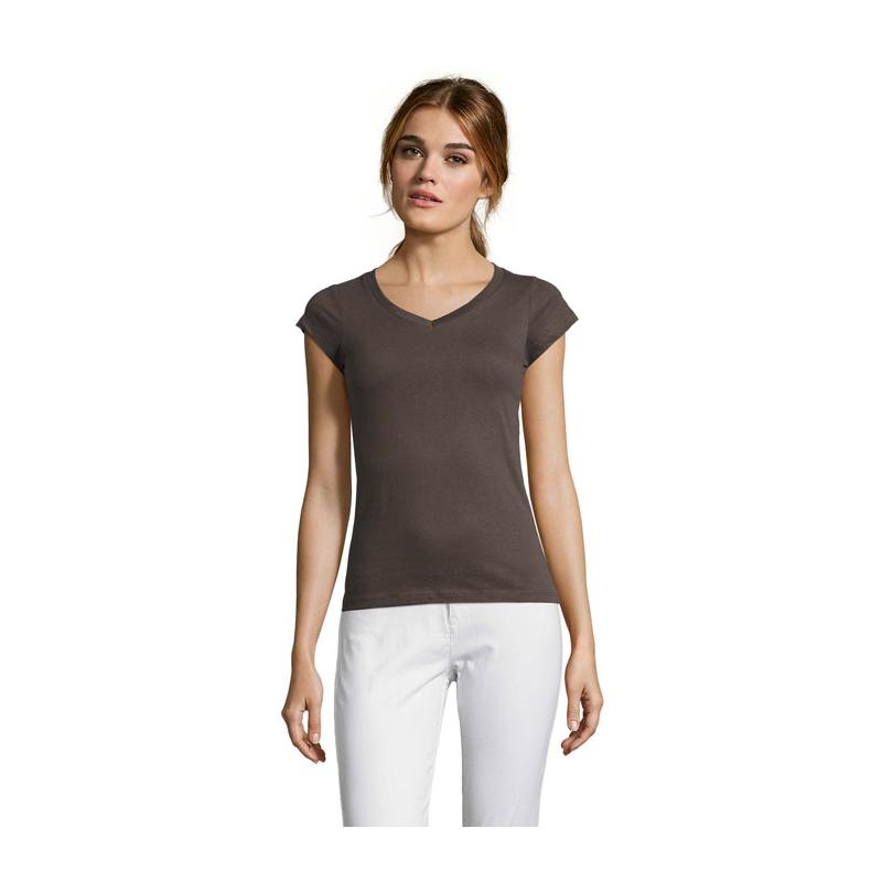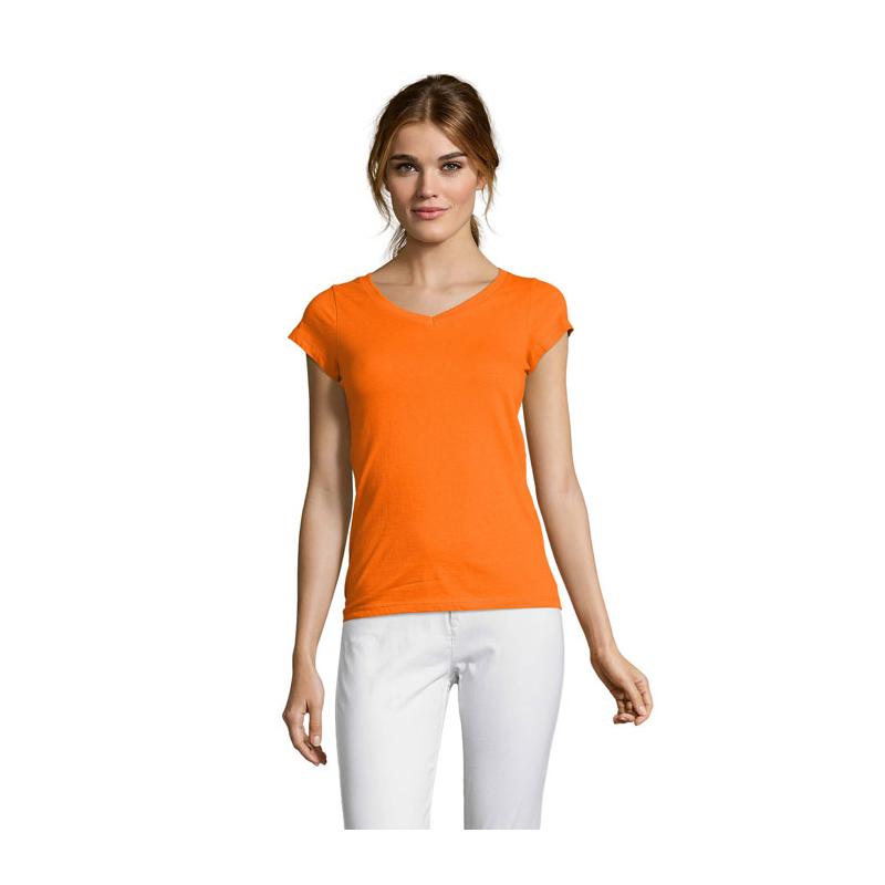 Sol's moon dames t-shirt 150g m². Het welbekende met diepe v-hals . In de versie voor dames, getailleerd model. Perfect modewereld. 100% halfgekamd katoen. Verstevigingsband in nek. Aansluitende snit. V-Hals ribbord elastaan. Met zijnaad.