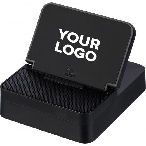 Gerecycleerd ABS 3-in-1 draadloze oplader, luidspreker en telefoonhouder in een kubusvormig ontwerp. Beschikt over 15W snel draadloos opladen, 5W luidsprekerfunctie en draadloze verbindingstechnologie versie 5.4. Bevat een 1200 mAh batterij, metalen gaas aan de voorzijde en gerecycled PU-detail aan de bovenkant. Input: 5V/500mA. Voorzien van een gerecycled logo. Individueel verpakt in een bruine kartonnen doos.
