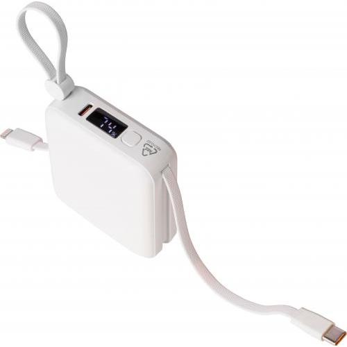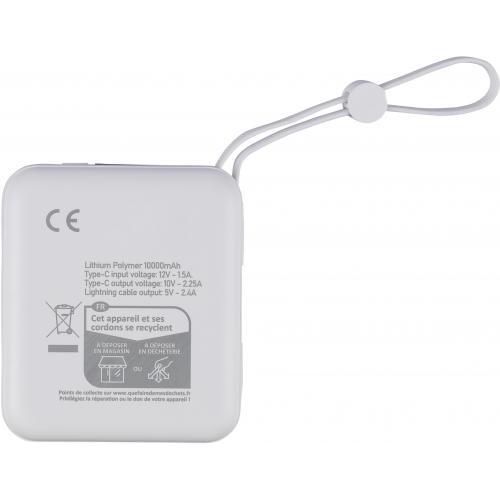 Gerecyclede ABS-powerbank met 10.000 mAh Li-ion batterij en 22,5W snellaaduitgang. Voorzien van een geïntegreerd TPE-draagkoord dat ook dienst doet als oplaadkabel met Lightning- en Type-C-connectoren. Uitgerust met een digitale LED-display bovenop voor het weergeven van de batterijcapaciteit. Inclusief Type-C in-/uitgang en Type-A ingang. Biedt bescherming tegen oververhitting, kortsluiting, overspanning en overstroom. Voorzien van label met gerecycleerd ABS-logo op de achterzijde