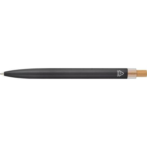 Gerecycleerde aluminium gelakte pennen set bestaande uit een balpen met bamboe drukknop, rPET afwerking en metalen clip, en een rollerpen met bamboe en rPET detail in de dop en bijpassende metalen clip. Beide pennen zijn voorzien van een gegraveerd gerecycled logo. Geschatte schrijflengte: 700 meter voor de balpen en 500 meter voor de rollerpen. Set is verpakt in een gekleurde geschenkdoos van gerecycled karton. Blauwe inkt.