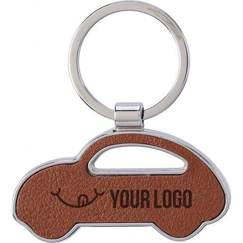 Gerecycled lederen sleutelhanger met een metalen ring. Autovorm. Inclusief in reliëf aangebracht gerecycled lederen logo aan de zijkant. Per stuk verpakt in een bruin kartonnen sleeve.
