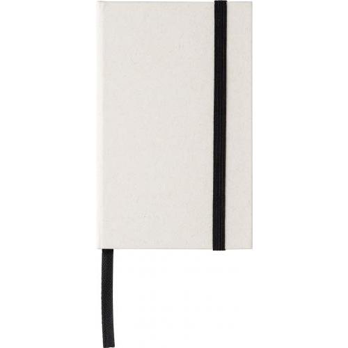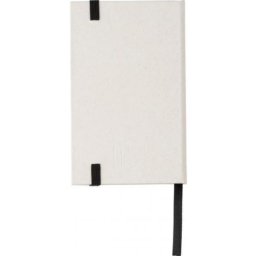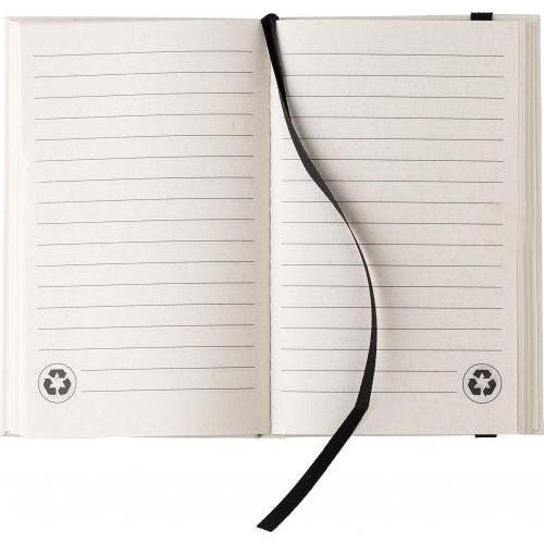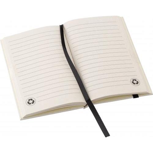 Gerecycled melkpak notitieboek A6 met 80 vellen, elastische band en lint. Gemaakt van 70% gerecycled melkpak en 30% gerecycled papier. Inclusief de melkpak hete stempel op de onderkant van de omslag.