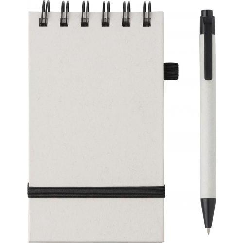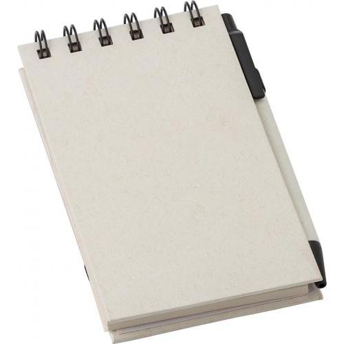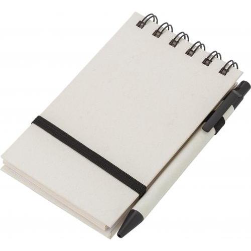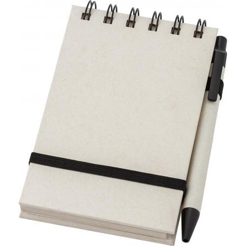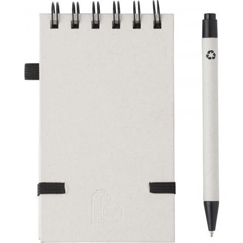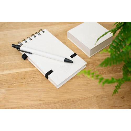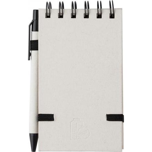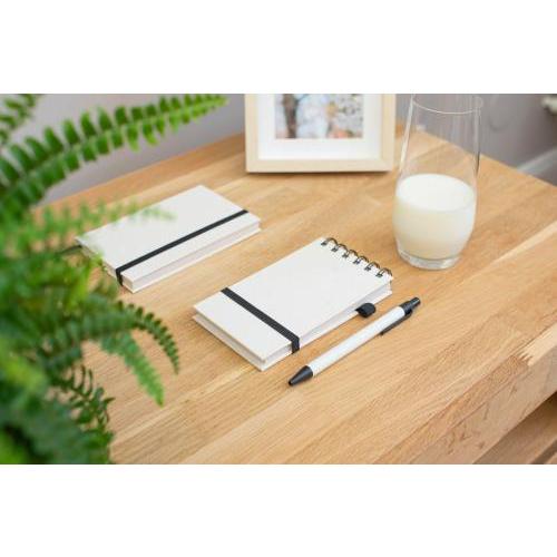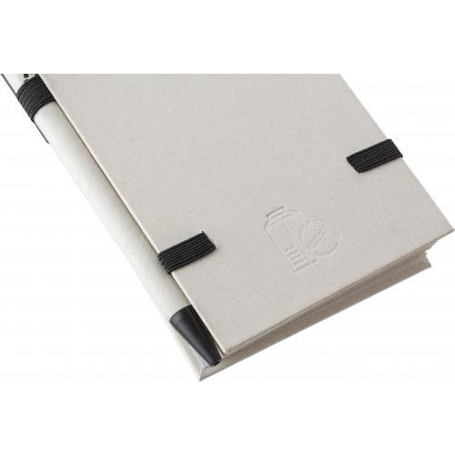 Gerecyclede melkpak notitieboek A6 met 70 vellen, elastische band en penlus. Bijpassende balpen met blauwe inkt. Gemaakt van 70% gerecycled melkpak en 30% gerecycled (gewoon) papier. Inclusief de melkpak hete stempel aan de achterkant van de omslag.