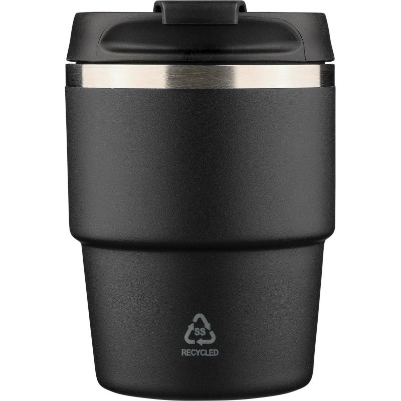 Gerecyclede roestvrijstalen dubbelwandige vacuümmok (175?ml). De binnenzijde is van roestvrij staal 304 en de buitenzijde van roestvrij staal 201. Voorzien van poedercoating en een PP-schroefdeksel. Compact formaat, past onder de meeste koffiemachines. Voorzien van een gelaserd gerecycled logo op de voorzijde. Verpakt in een bruine kartonnen doos.