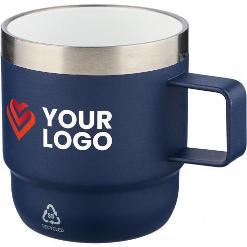 Gerecyclede roestvrijstalen beker (180 ml) met dubbelwandige constructie. De binnenkant is van roestvrij staal 304 en de buitenkant van roestvrij staal 201, met aan de binnenzijde een keramische coating voor verbeterde hygiëne en minder smaak- of geuroverdracht. Voorzien van een handvat en een gelaserd logo van gerecycled roestvrij staal aan de voorkant. Individueel verpakt in een bruine kartonnen doos.