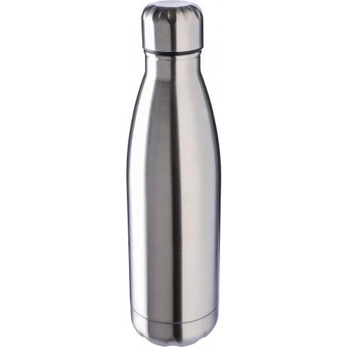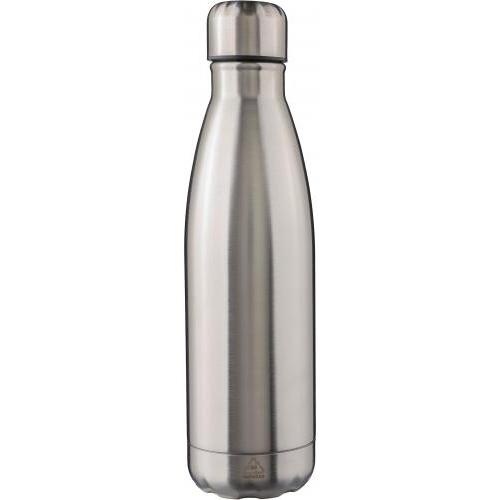 Gerecycled roestvrijstalen dubbelwandige fles (500 ml) met schroefdop. De binnenkant is van roestvrij staal (s/s 304) en de buitenkant van (s/s 201). Gerecycled logo gegraveerd op de fles. Per stuk verpakt in een bruin kartonnen doos.