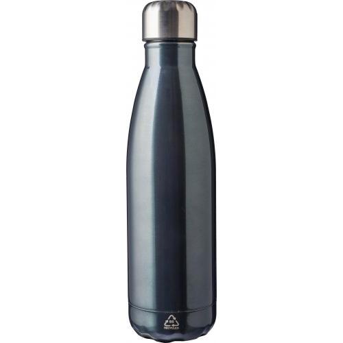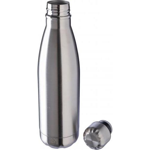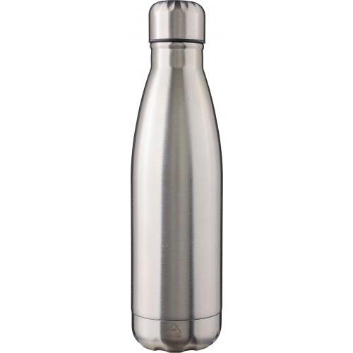 Gerecycled roestvrijstalen enkelwandige fles (650 ml) met schroefdop. Gemaakt van roestvrij staal (s/s304). Gerecycled logo gegraveerd op de fles. Per stuk verpakt in een bruin kartonnen doos.