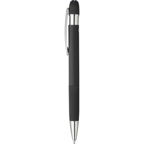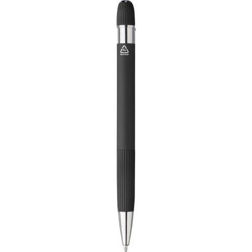 Gerecyclede aluminium balpen met rubberen afwerking. Voorzien van gestreepte details op de grip en bovenzijde, een verchroomde kunststof punt en drukknop met metalen clip. Inclusief lasergegraveerd gerecycled logo. Blauwe inkt.