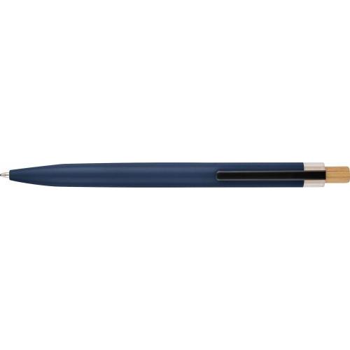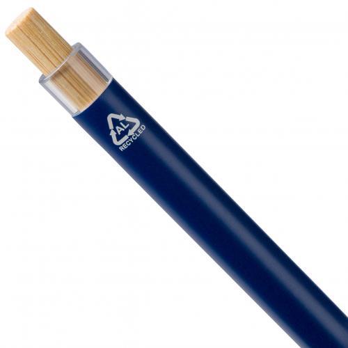 Gerecycleerde aluminium gelakte drukbalpen met bamboe drukknop, rPET afwerking en metalen clip. Voorzien van een gegraveerd gerecycled logo. Schrijflengte ca. 700 meter. Blauwe inkt.