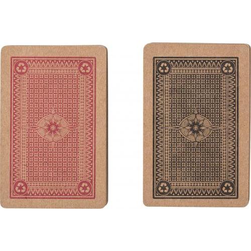 Gerecyclede kartonnen kaartspellen, set van twee. 54 kaarten per set (52 kaarten + 2 jokerkaarten). Verpakt per deck in een kraft papieren doos en volledig in een stevige kraft papieren doos.