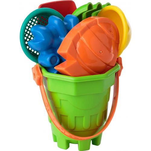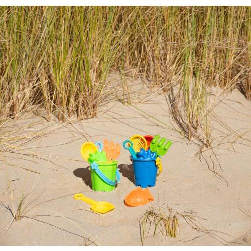 Gerecyclede PP strandemmer (4 verschillende stijlen). Elke emmer bevat een schep, hark, schepje, zandzeef en twee vormonderdelen. Afzonderlijk verpakt in een net, inclusief kartonnen kaart.