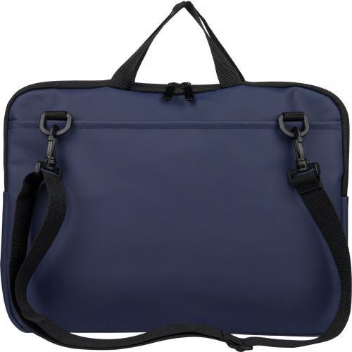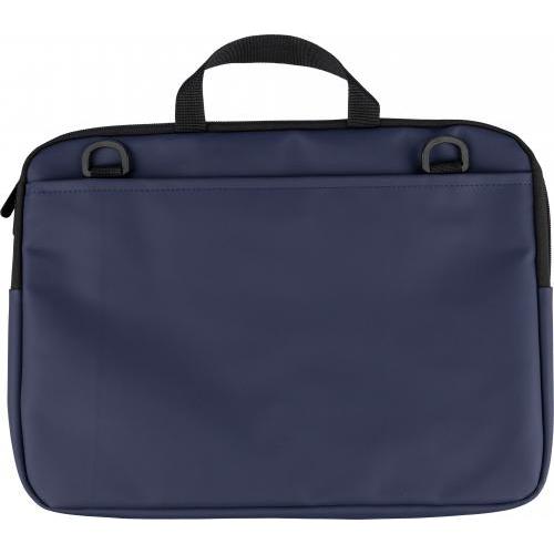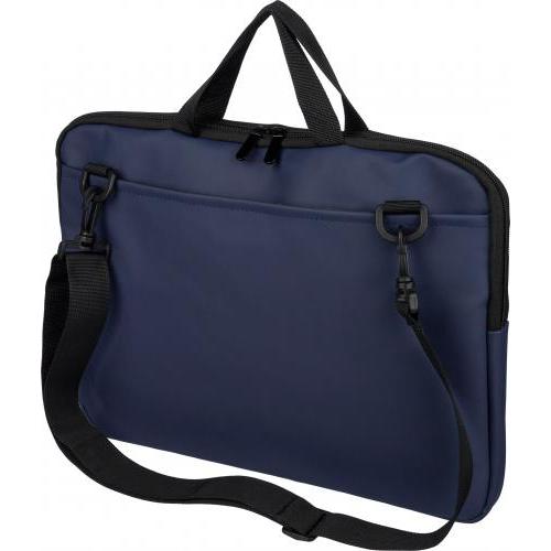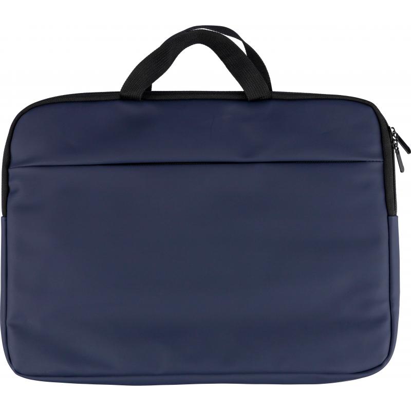 Laptoptas van gerecycled PU, geschikt voor laptops tot 15 inch, met 4 mm vulling en een voering van 210D gerecycled polyester. Voorzien van een voorvak met ritssluiting, een achtervak met klittenbandsluiting, twee korte draaghengsels en een verstelbare schouderriem. Inclusief een klein gerecycled logo in het binnenlabel.