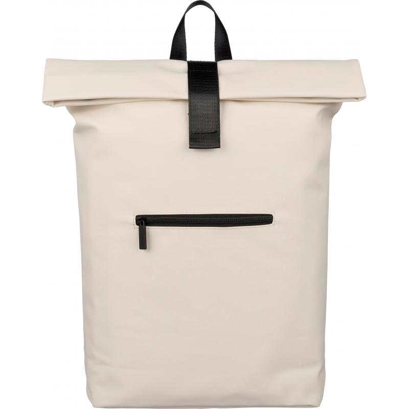 Rugzak van gerecycled PU met een inhoud van 19 liter, rolltop-sluiting en klittenbandstrip. Voorzien van een klein voorvak met ritssluiting, een binnenvak geschikt voor een 16-inch laptop en een voering van 210D gerecycled polyester. Inclusief verstelbare geventileerde schouderbanden, een handvat aan de bovenkant en één gerecycled label aan de binnenzijde.
