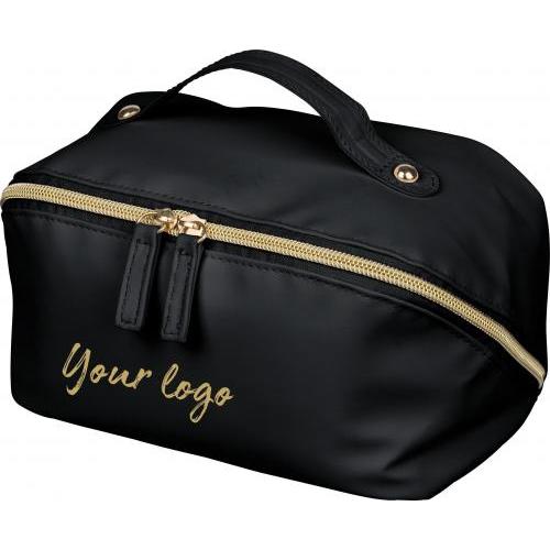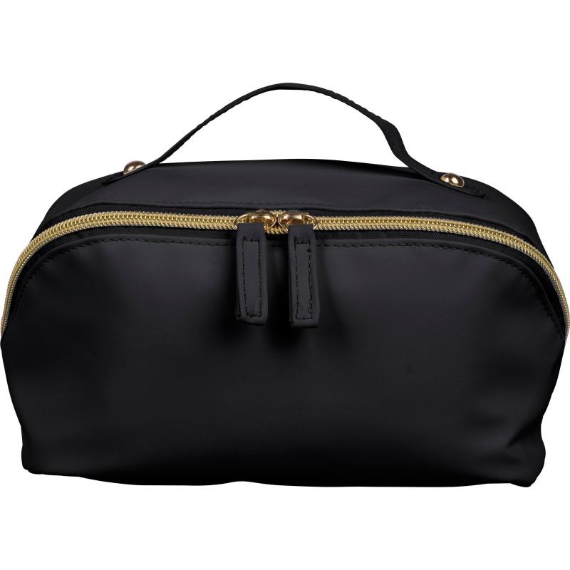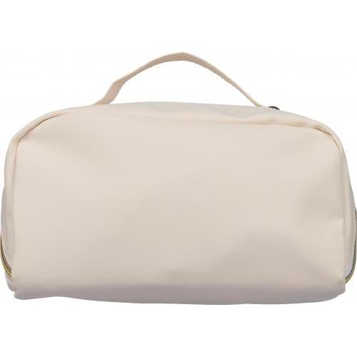Toilettas met rits van gerecycled PU met centrale ritssluiting voor een brede opening en gemakkelijke toegang. Voorzien van een kort handvat, een ruim interieur met vier vakken, waaronder één klein binnenvak met ritssluiting. Afgewerkt met een voering van 210D gerecycled polyester en één gerecycled label aan de binnenzijde.