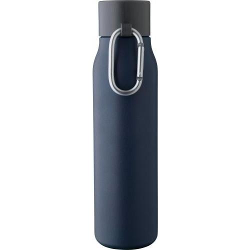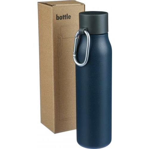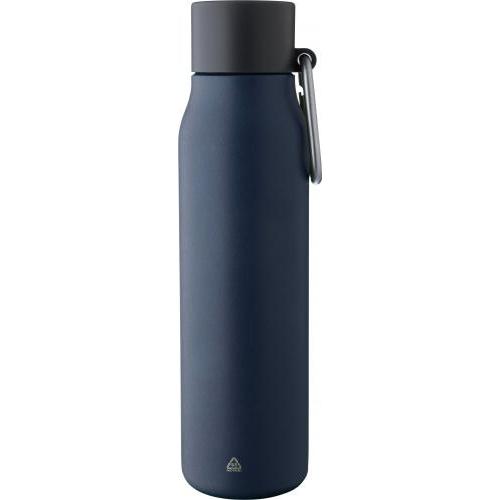 Gerecyclede roestvrijstalen drinkfles (600 ml). De binnenkant is gemaakt van roestvrij staal 304 en de buitenkant van roestvrij staal 201. Voorzien van een lekvrije zwarte PP-dop met een aluminium karabijnhaak en een draaglus. De karabijnhaak is niet geschikt voor klimmen. Houdt dranken 6 uur warm of 9 uur koud. Voorzien van een gegraveerd gerecycled logo op de voorkant. Per stuk verpakt in een bruine kartonnen doos.