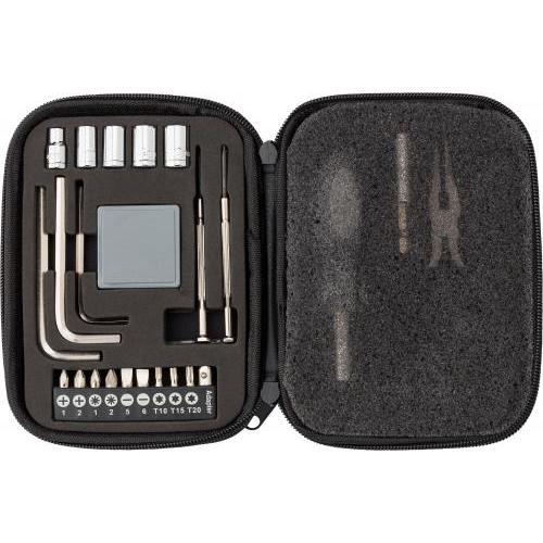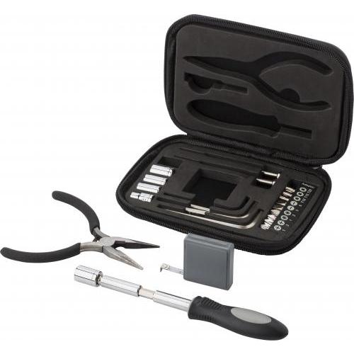 PU lederen etui met gereedschapsset, sluit met ritssluiting. De set bevat: 5 doppen, 3 zeskantschroevendraaiers, 9 schroefbits, 1 dopsleutel, 1 meetlint, 2 precisieschroevendraaiers, 1 schroevendraaierhandvat, 1 verlengstuk, 1 tang.