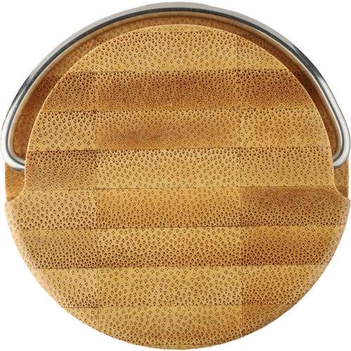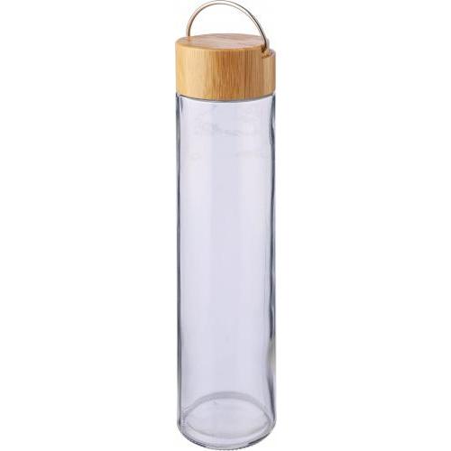 Glazen drinkfles (500 ml) met bamboe dop en metalen handvat. Per stuk verpakt in een bruin kartonnen doos.