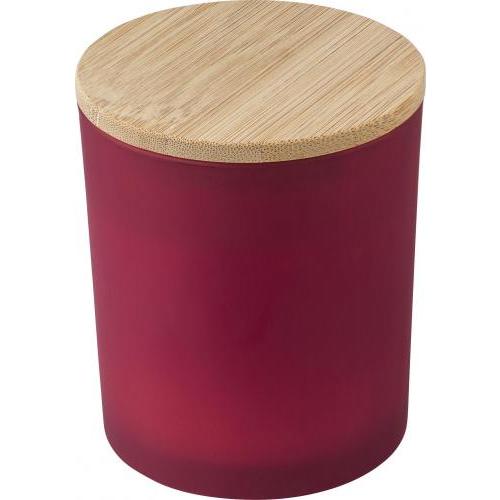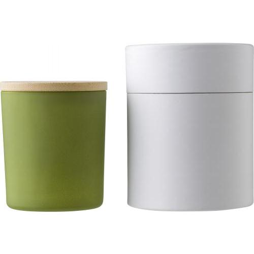 Glazen kaars met plantaardige was en een deksel van bamboe. De kaars bevat voornamelijk plantaardige was (carnaubawas) en heeft een brandtijd van ongeveer 46 uur. Vier geuren afhankelijk van de kleur van het glas: kaneel (rood), vanille (wit), sandelhout (zwart) en jasmijn (groen). Individueel verpakt in een witte koker.