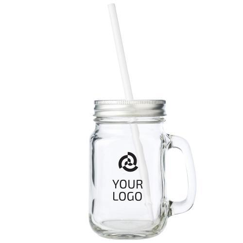 Glazen mason jar (480 ml) met zilverkleurige deksel met uitsparing en kunststof rietje. Prijs per stuk, afname per 32 stuks.