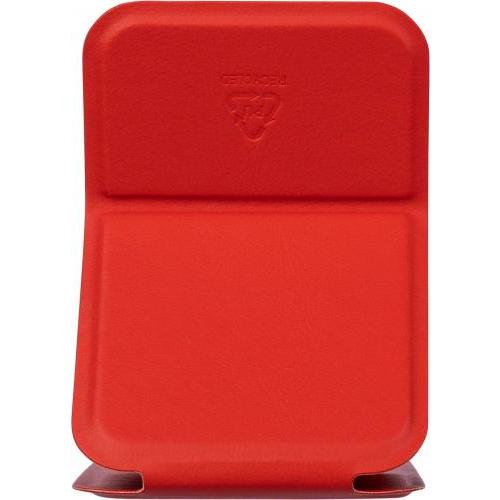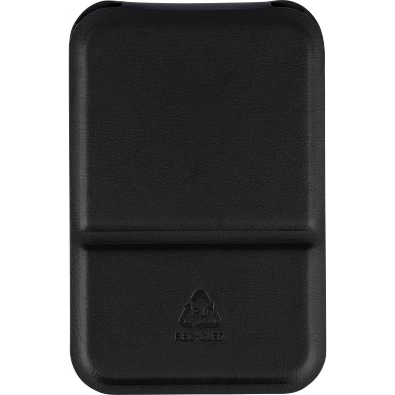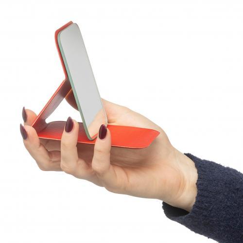 Glazen spiegel met een opvouwbare hoes van gerecycled PU, ontworpen om rechtop te staan wanneer geopend. Pocketformaat van 70 x 11?cm, verkrijgbaar in zwart, wit en rood. Voorzien van een reliëflogo van gerecycled materiaal. Verpakt in een papieren zakje.