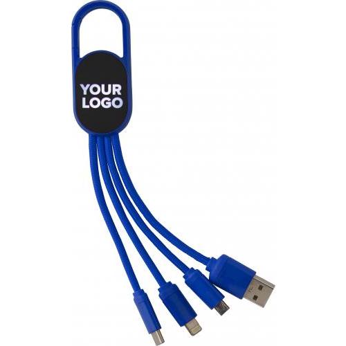 4 in-1 Laadkabel set met haak. De set heeft een USB, USB-C, micro USB en Lightning plug. Na laser graveren licht het logo op wanneer de kabel in gebruik is.