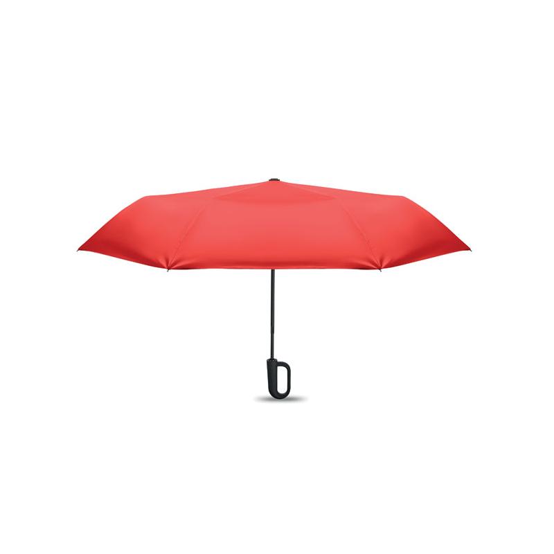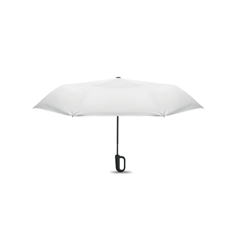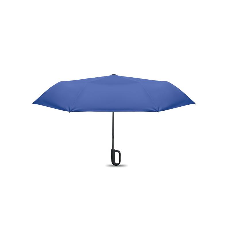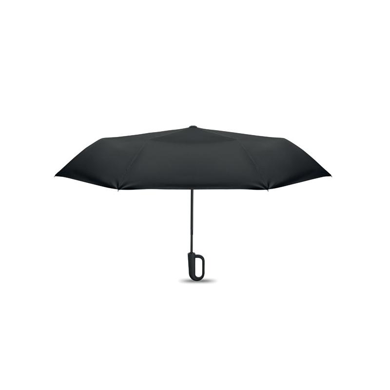 Opvouwbare 21'' windproof paraplu met volledig zwart geplatteerd fiberglas frame 2 secties. Glasvezel baleinen. 190T rpet pongee panelen. D-Vormig karabijnhaakhandvat rubberen afwerking. Automatisch openen en sluiten. Inclusief etui