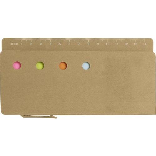 Kartonnen memoblaadjeshouder met liniaal (13 cm), 4 verschillende kleinere zelfklevende memoblaadjes (100 stuks) en 1 groter formaat memoblaadje. Incl. kartonnen balpen met drukmechanisme, blauwschrijvend.