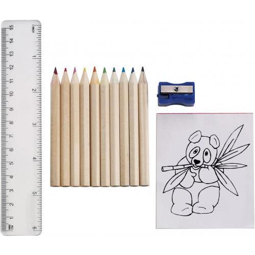 13-Delige tekenset bestaande uit 10 kleurpotloden, kleurboekje, liniaal (15cm) en puntenslijper, in een kartonnen 'ECO' verpakking.