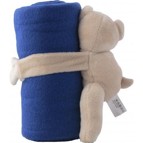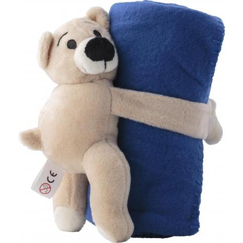 Knuffelbeer met fleece (180 gsm) deken (uitgevouwen: ca. 180 x 80 cm). Handen bij elkaar gehouden met klittenband.