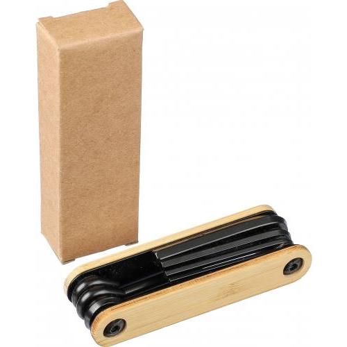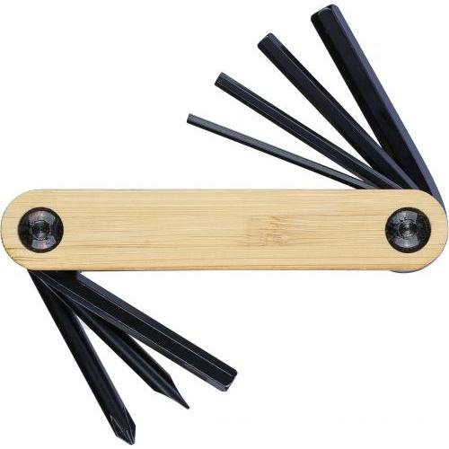 Koolstofstalen gereedschapsset met bamboe accenten. Bevat 7 gereedschappen: inbussleutels, kruiskopschroevendraaier en platte schroevendraaier. Per stuk verpakt in een bruin kartonnen doosje.