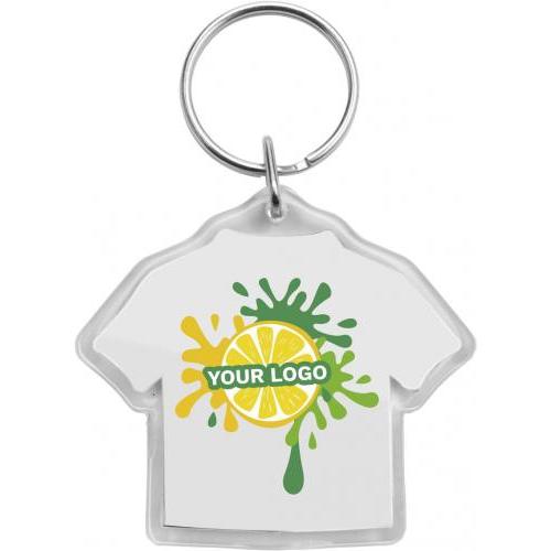 Kunststof sleutelhanger aan metalen sleutelring in t-shirt vorm.