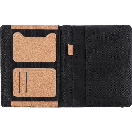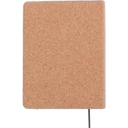 Kurken schrijfmap, ca. A5-formaat. Met binnenvakken, elastische band, penlus en uitneembaar A5-notitieboek met 192 gelinieerde pagina's gerecycled papier (70 g/m²). Verpakt in vloeipapier.