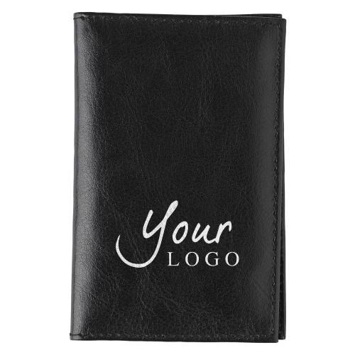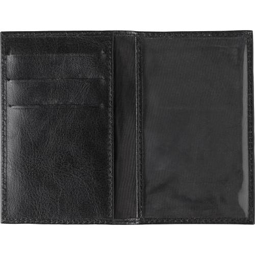 Leren (geitenleer) RFID (anti-skimming) creditcard portemonnee met drie vakken aan de linkerkant en groot transparant venster aan de rechterkant.