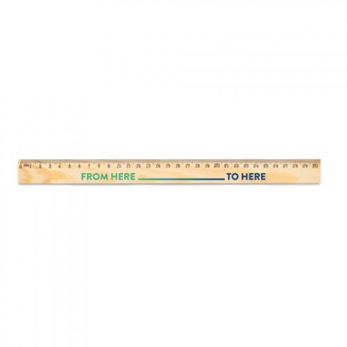 Liniaal van dennenhout met een schaal van 30 cm in zwart bedrukt. Vanwege het natuurlijke materiaal kunnen de kleur van het product en het drukresultaat per product afwijken