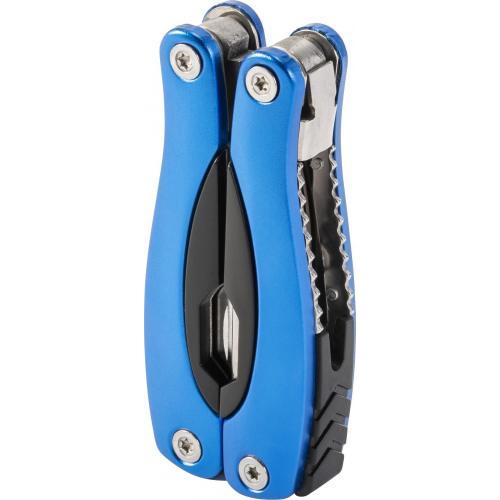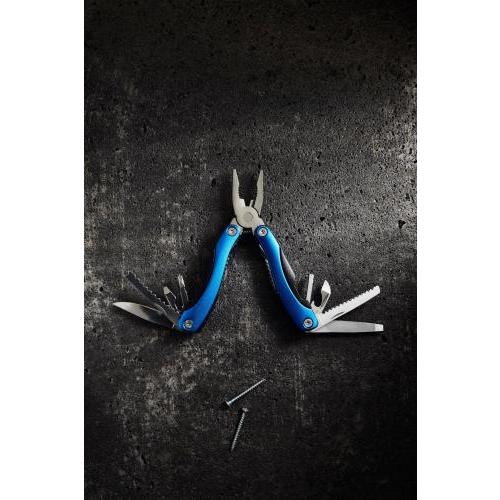 Metaal, multifunctioneel gereedschapset met ABS accenten. De tool bestaat uit: een tang, een zaag, een mes, twee schroevendraaiers (platte kop en kruiskop), een vijl, een flessenopener, een visschraper, een notenkraker en een liniaal met inches. In hoes.